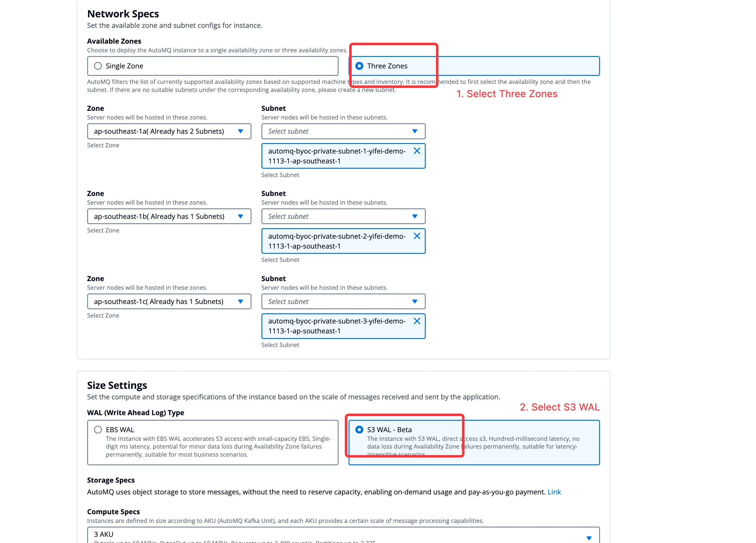 - Create an instance, and in the network configuration, select three availability zones. In the storage specification, choose S3WAL for the WAL type.