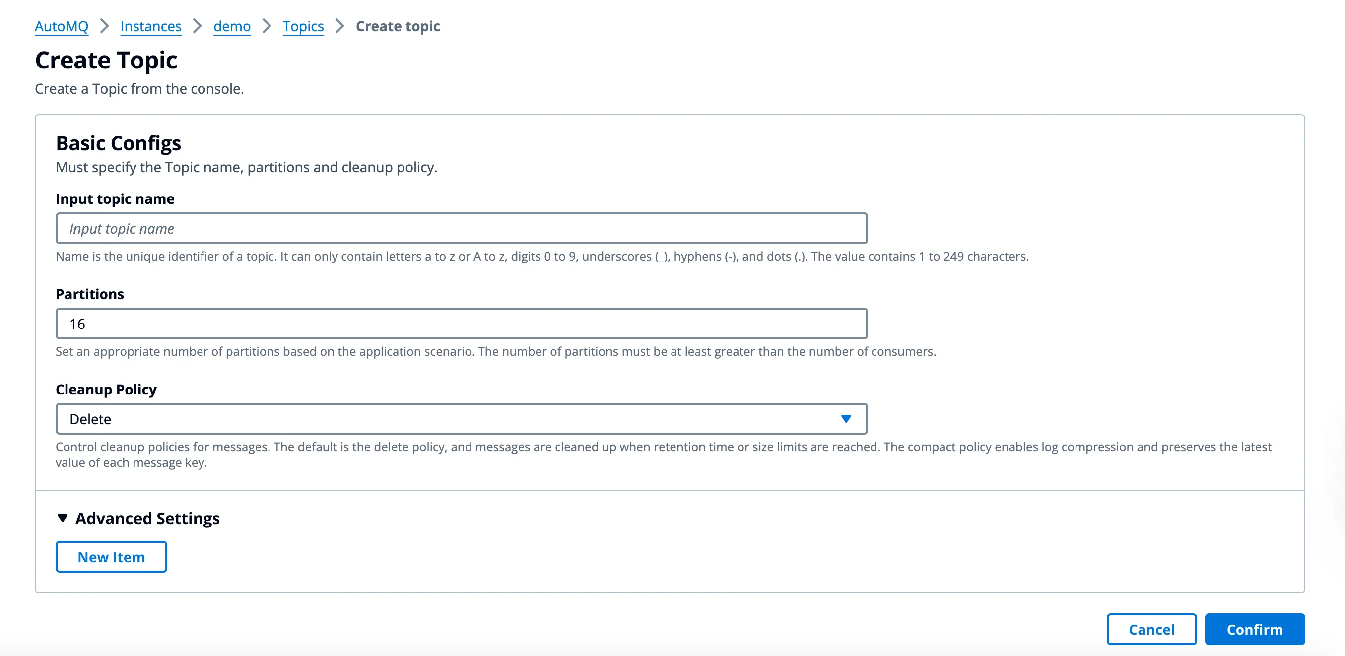 - Click Create New Topic, fill in the required parameters, and create the topic.