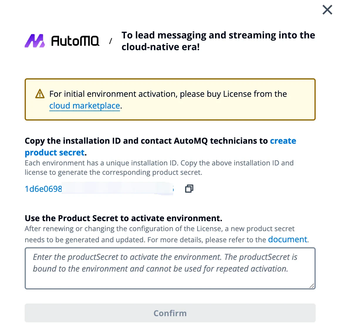 - Gather the environment Installation ID and configure the license information purchased in the previous step. Contact AutoMQ technical personnel to obtain the activation product key.