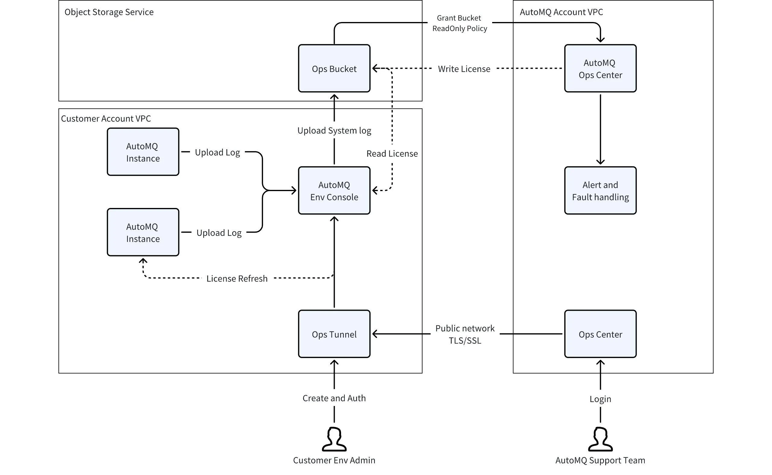 AutoMQ’s operational authorization includes three scenarios:- Scenario 1: System monitoring and alerts, requiring read permissions. During the operation of the AutoMQ Cloud BYOC environment, system logs, inspection logs, and system metrics data are generated by the environment console and the AutoMQ data plane cluster. This data is automatically uploaded to the operational bucket specified when the user creates the environment. The AutoMQ service provider needs the user’s cloud account to authorize read permissions for this operational bucket. This allows the AutoMQ operational platform to monitor the stability and perform self-healing of the user’s cluster.