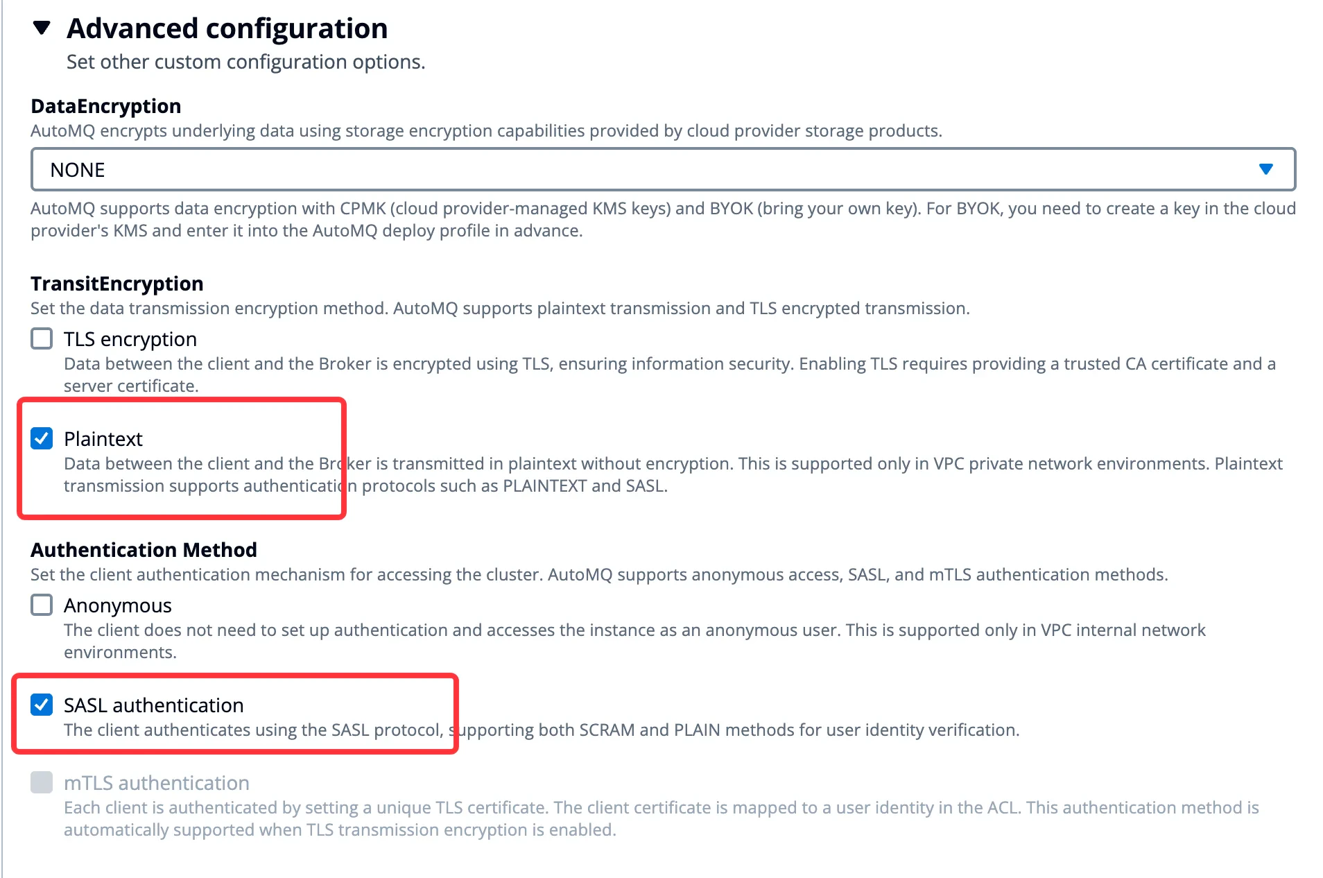 To use SASL_PLAINTEXT, click Advanced Options >> Enable the following parameters when creating an instance. Refer to the interface in the figure below: