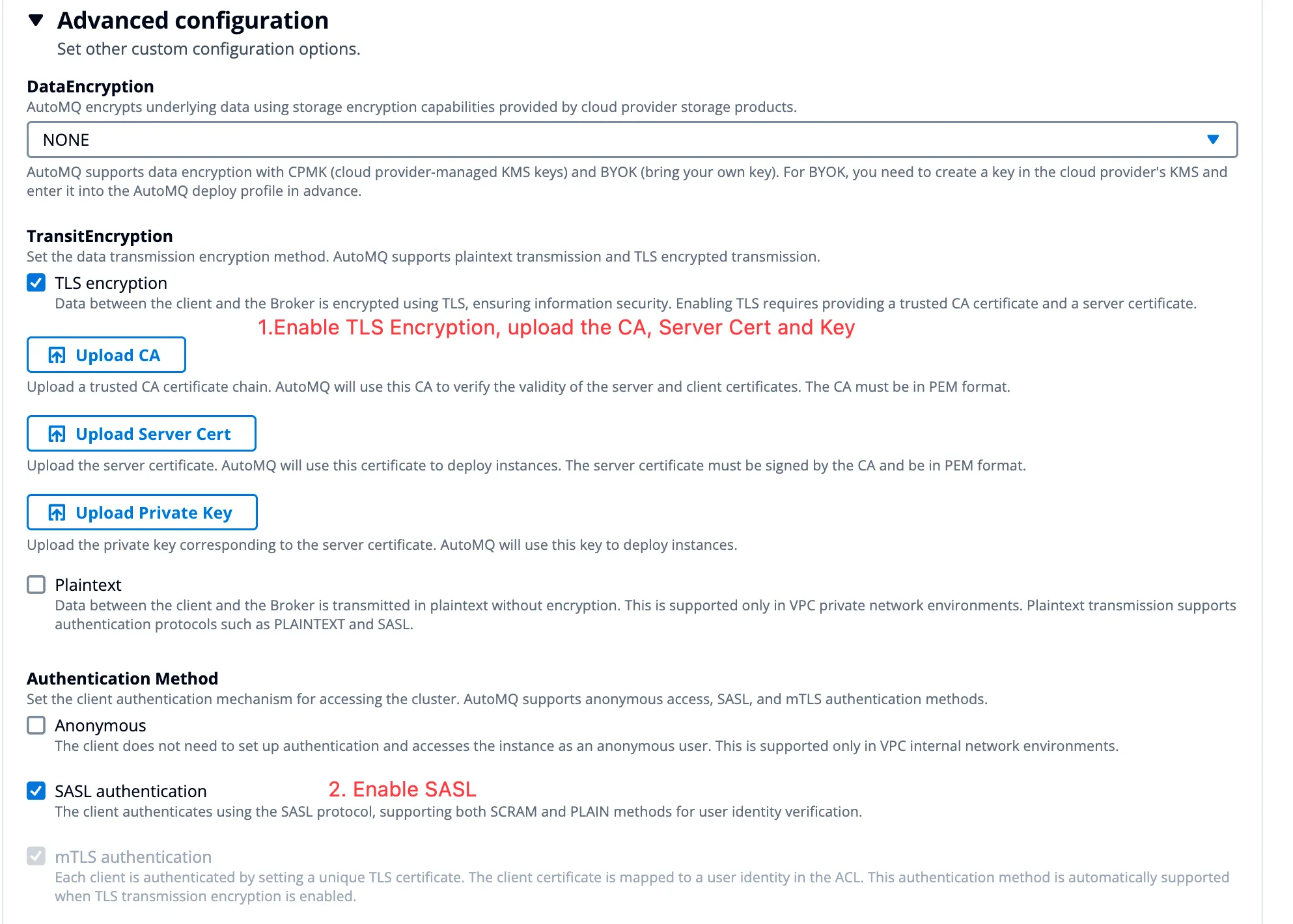Using SASL_SSL requires clicking on Advanced Options >> Enable the following parameters when creating the instance. Refer to the interface depicted in the diagram below: