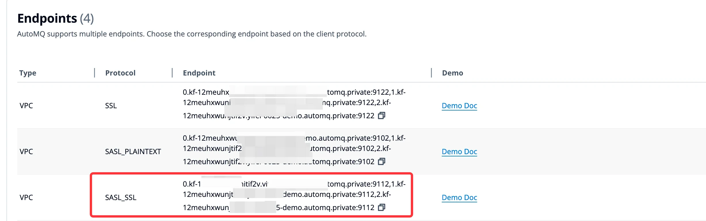 - After enabling SASL_SSL, access the instance details page to view the endpoint information.