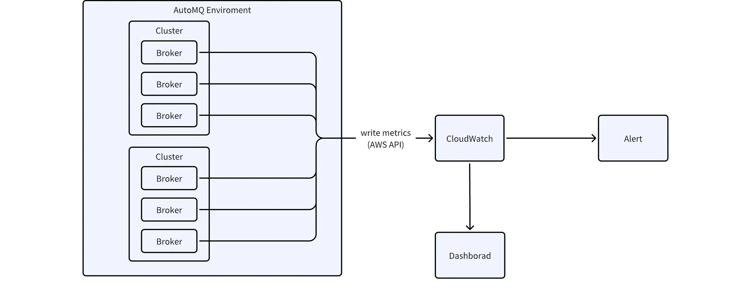 Internal components of AutoMQ support the collection of various Kafka Server Metrics data. However, the current business edition does not provide built-in Metrics dashboards and monitoring alert capabilities. Users can implement custom Metrics monitoring and analysis based on the integration features provided by AutoMQ. The overall architecture is referenced in the diagram below:
