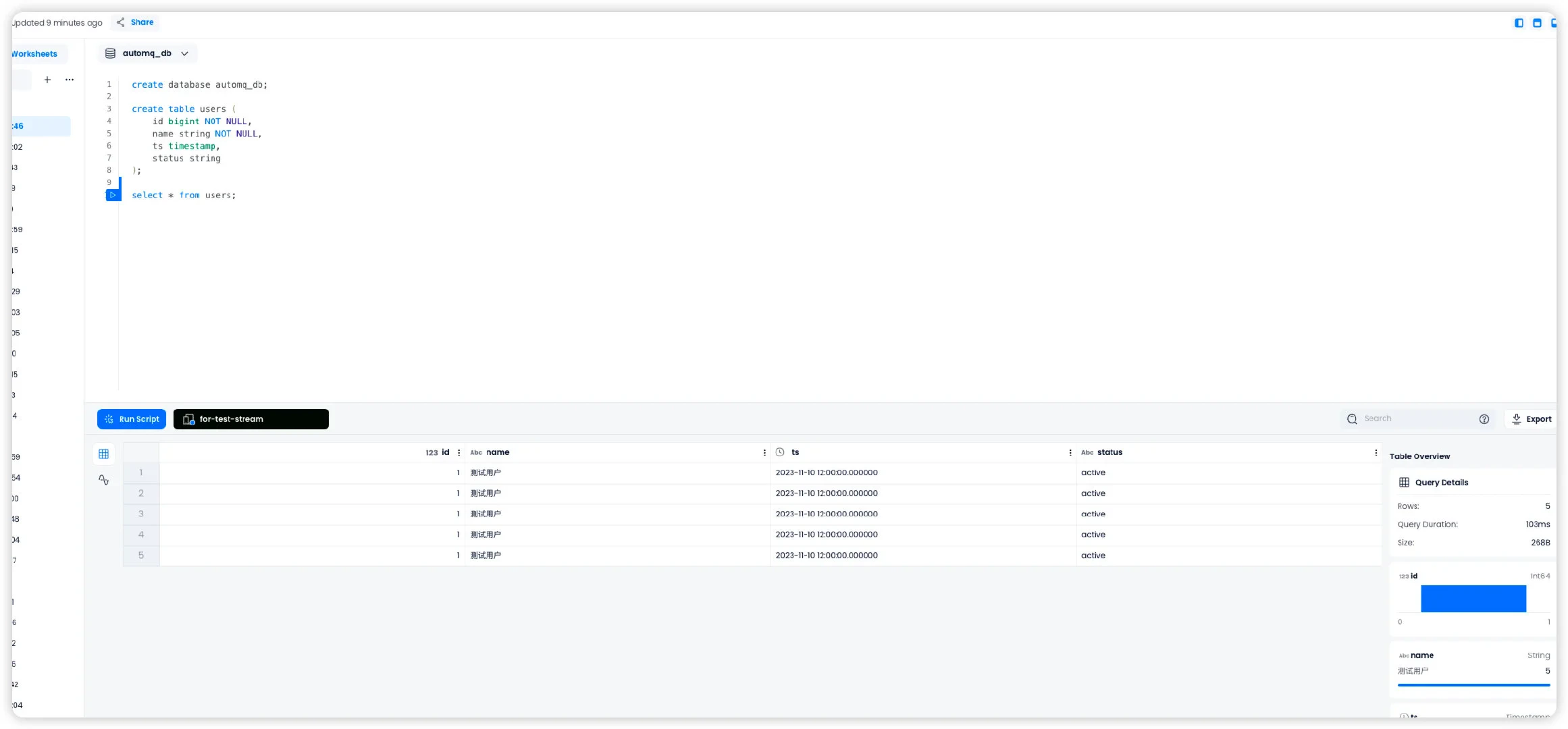 Navigate to the Databend Cloud worksheet and query the automq_db.users table. You should confirm that the data has been successfully synchronized from AutoMQ to the Databend Table.