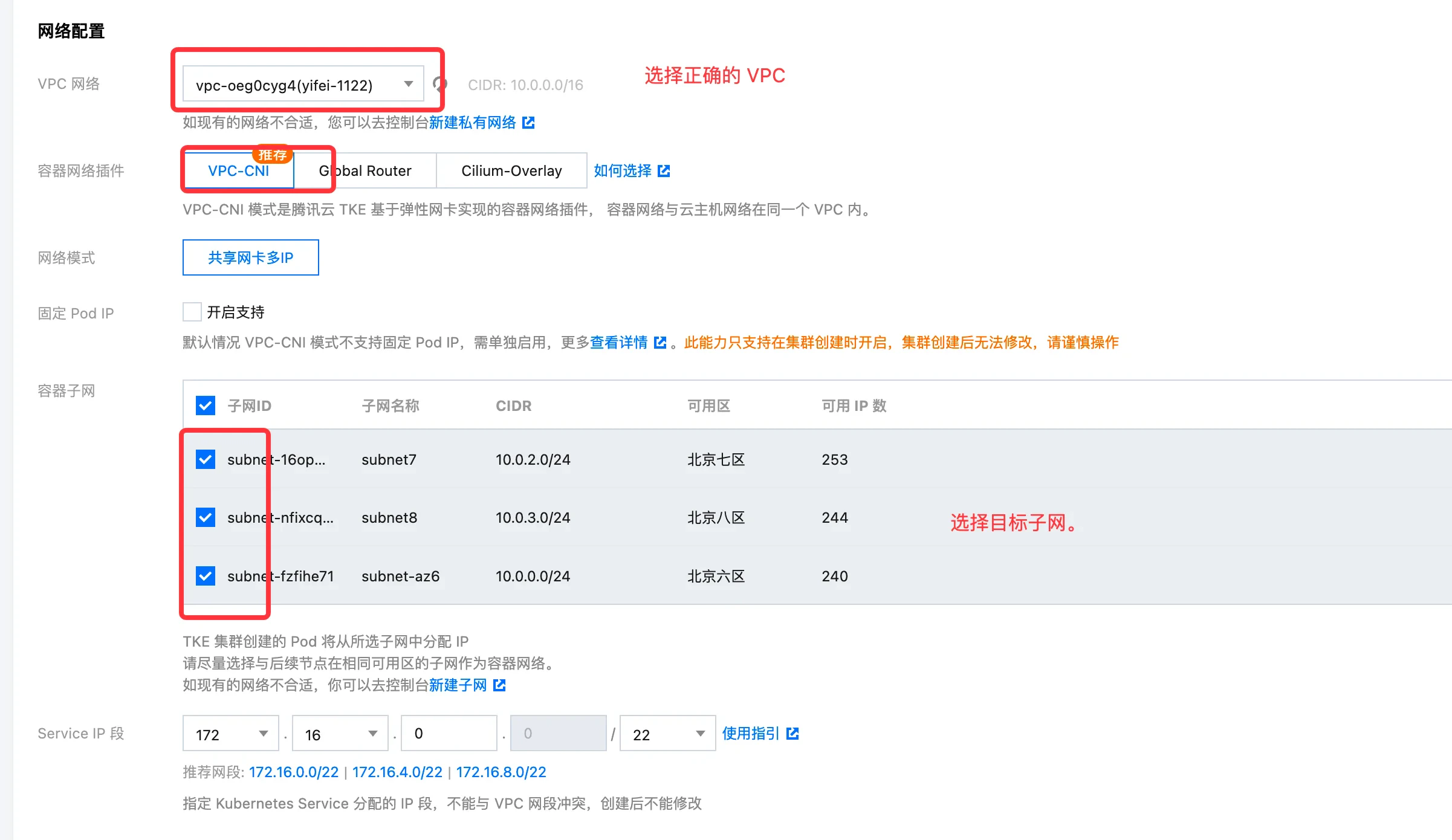 - 填写网络配置, 选择正确的 VPC,网络插件选择推荐的 VPC-CNI,容器子网选择所有需要的可用区。