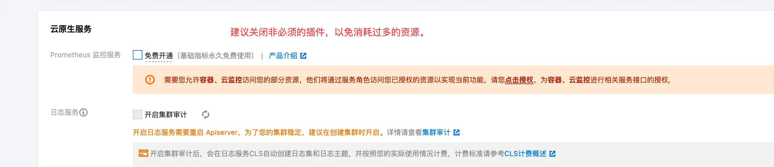 - 点击下一步,关闭非必须的 Prometheus 插件,完成创建 。