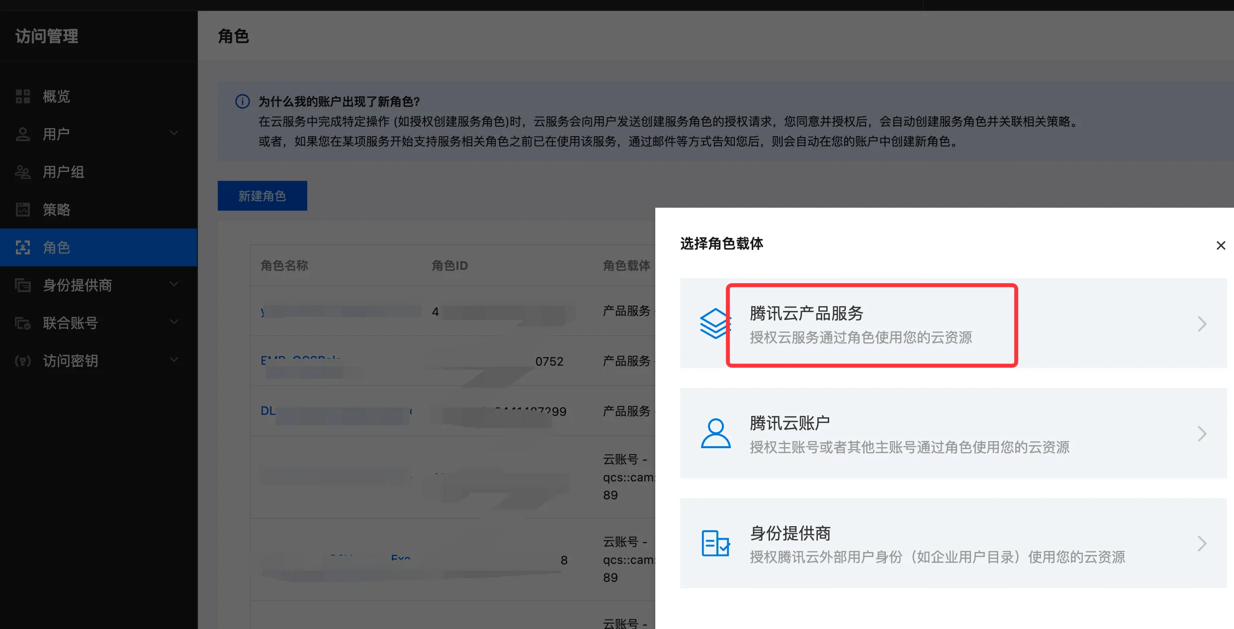 AutoMQ 数据面集群需要独立的节点池,该节点池需要绑定独立的 CAM 角色用于访问云资源的权限验证。因此,在创建 TKE 集群之前,需要前往 CAM 控制台创建自定义角色。操作步骤如下:- 前往 CAM 控制台,点击角色,新建角色, 选择腾讯云产品服务 。