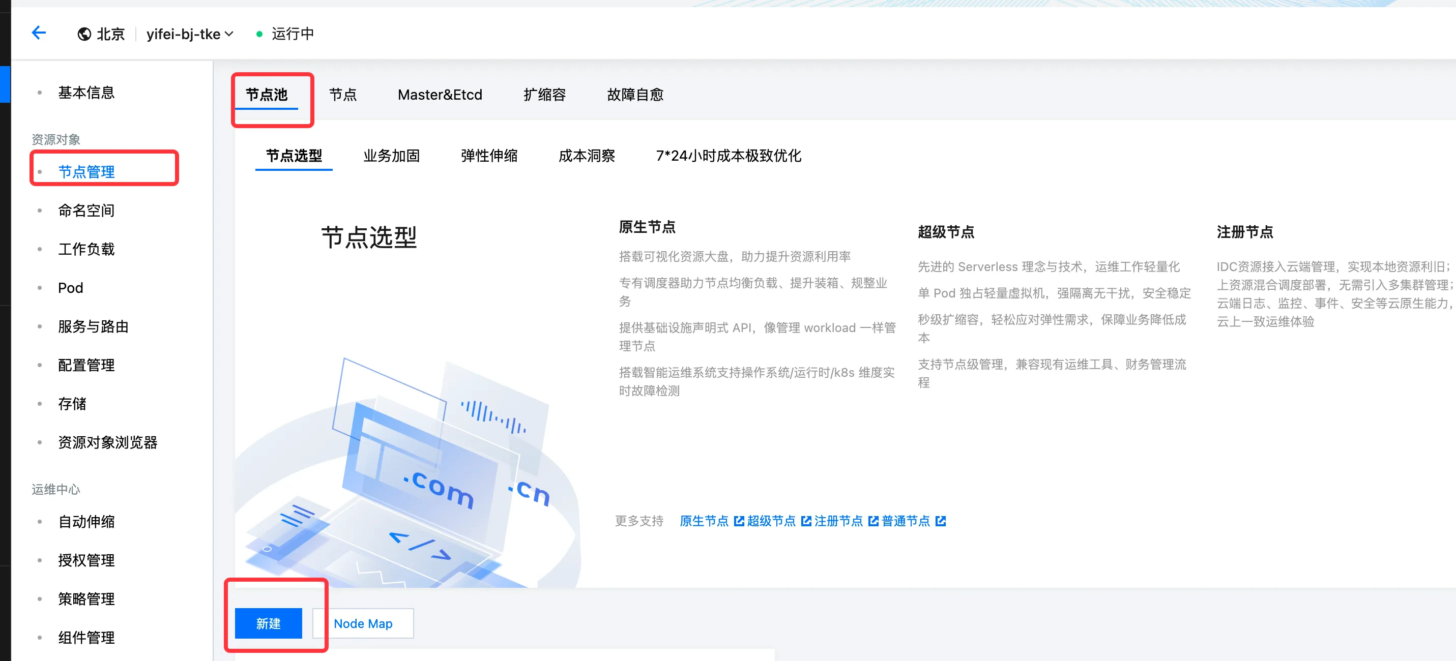参考概述▸,用户需要为 TKE 集群 创建一个公共节点池,用于部署 TKE 系统组件。参考以下步骤创建符合要求的节点池。- 进入步骤 2 创建的 TKE 集群详情,点击节点菜单 ,创建节点池 。