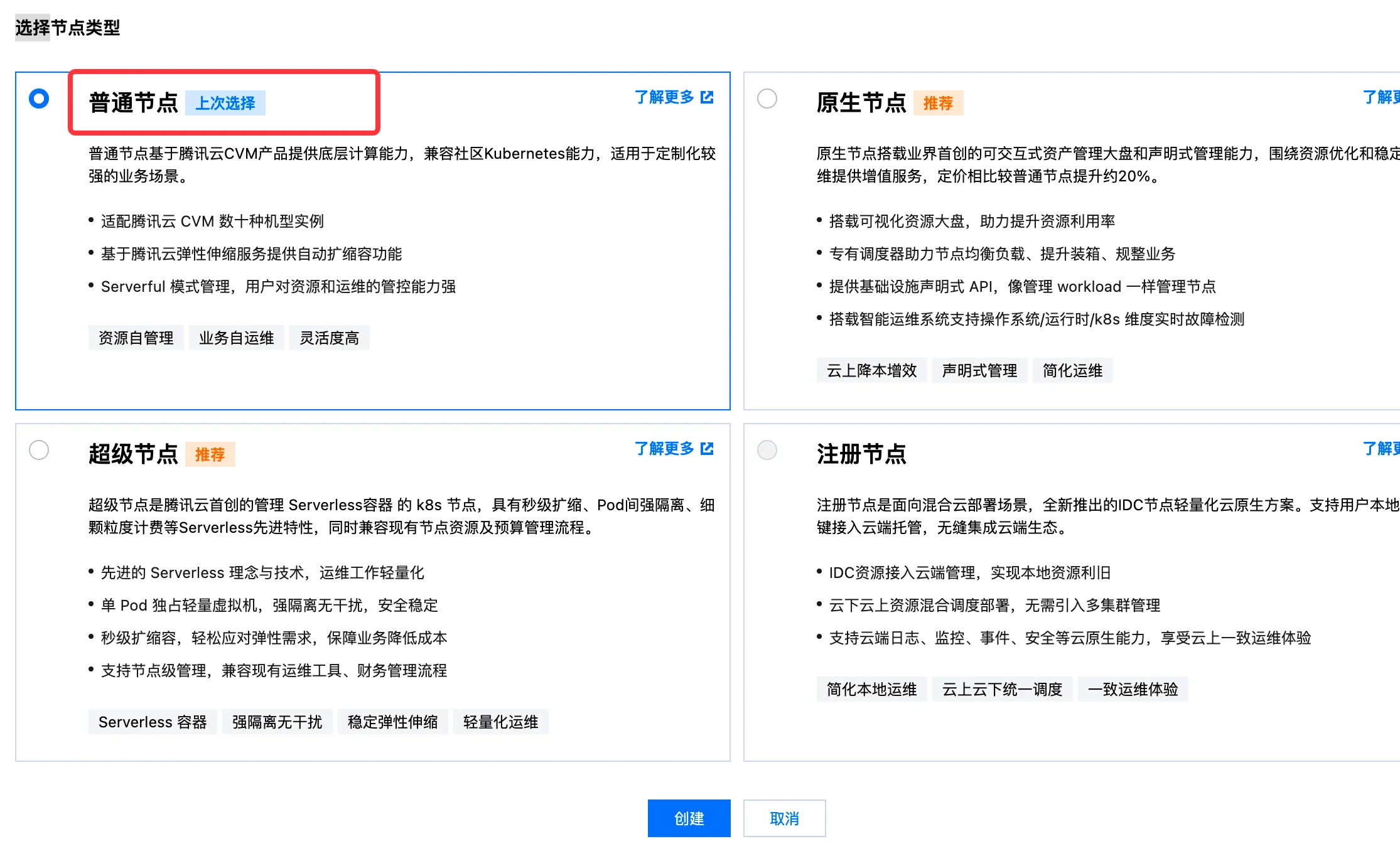 - 选择普通节点池类型, 参考下面的文档设置自定义参数,完成节点池创建。对于表格中没有说明的参数,请按照默认推荐值不要修改。