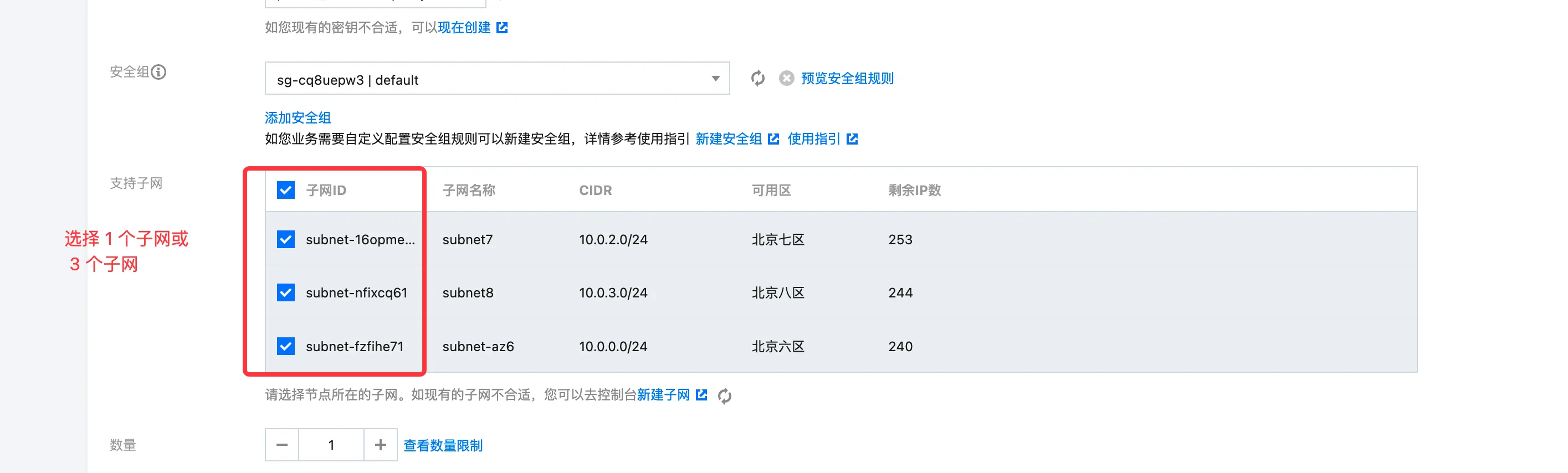 - 节点启动配置, 选择一个或三个子网,初始数量为 1。