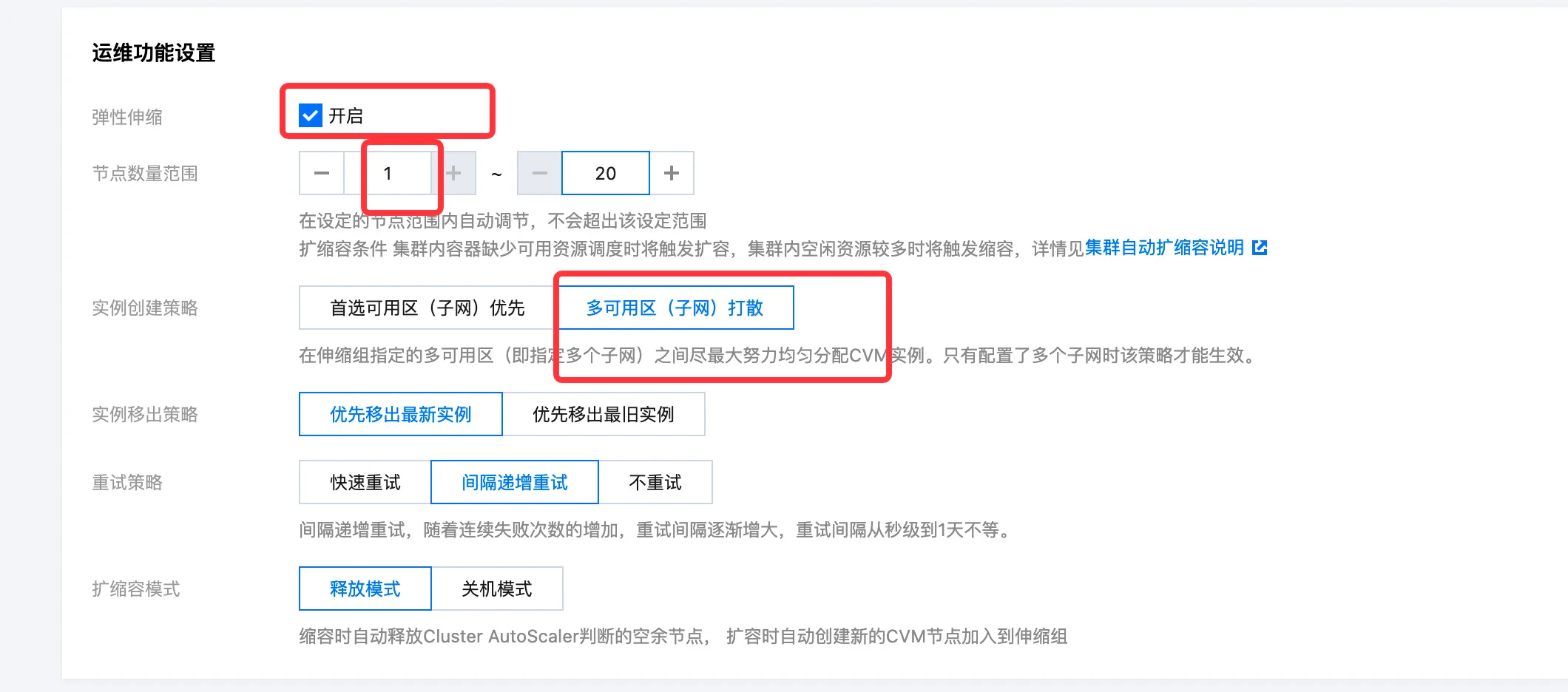 - 填写运维功能设置, 选择开启弹性伸缩,节点数量设置至少为 1,弹性上限建议和 TKE 集群规格以及未来需要部署 AutoMQ 的机器规模一致。实例创建策略,选择多可用区打散。