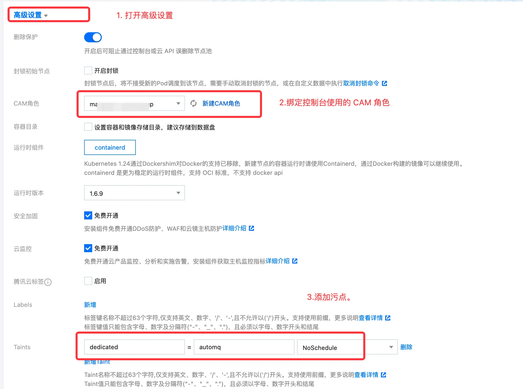 - 为节点池绑定 CAM 角色 ,信息来自 安装控制台后的输出参数 。然后点击创建节点池。 添加 AutoMQ 独占的污点。污点的键是dedicated,值是 automq,效果是 NO_SCHEDULE。