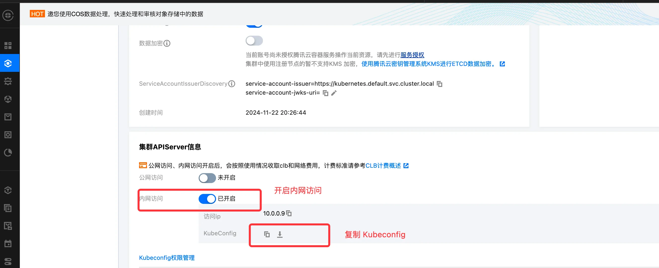- 找到 APIServer 配置菜单,获取 Kubeconfig 配置文件。