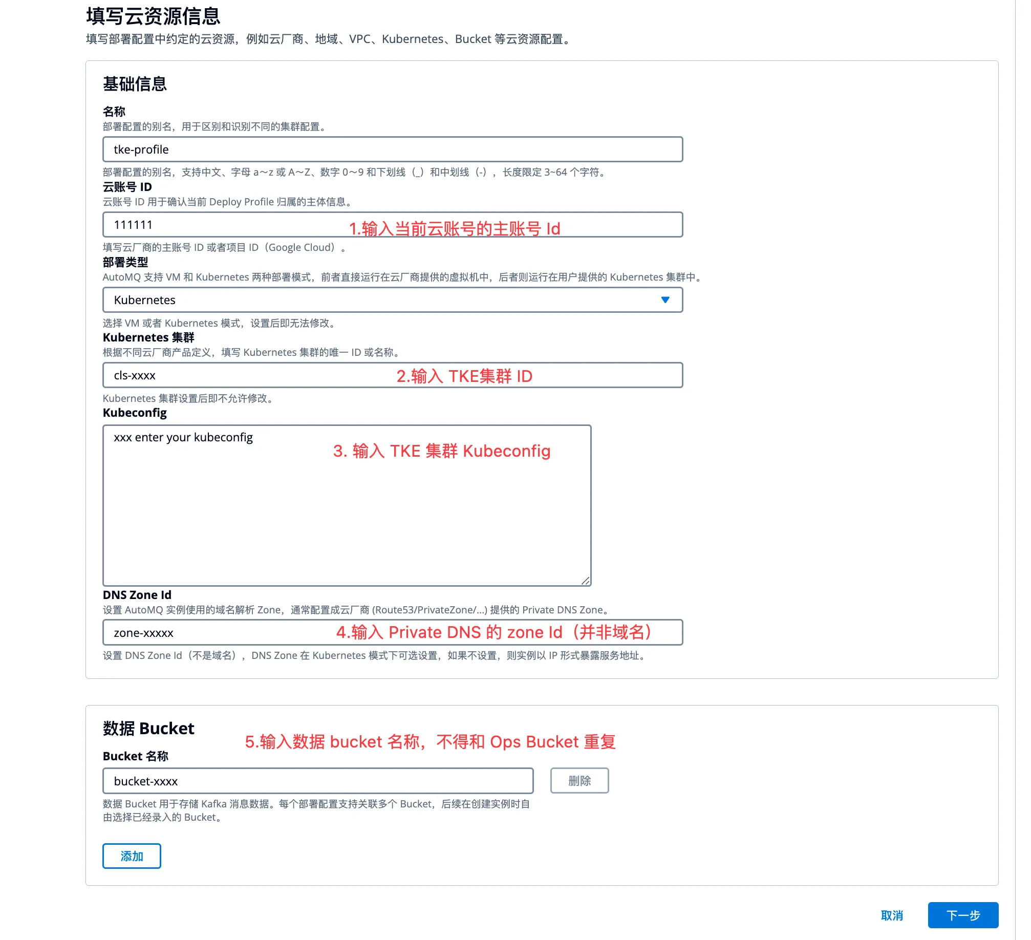 - Bucket 名称:填写用于部署 AutoMQ 存储消息的数据 Bucket,支持添加多个 COS Bucket。