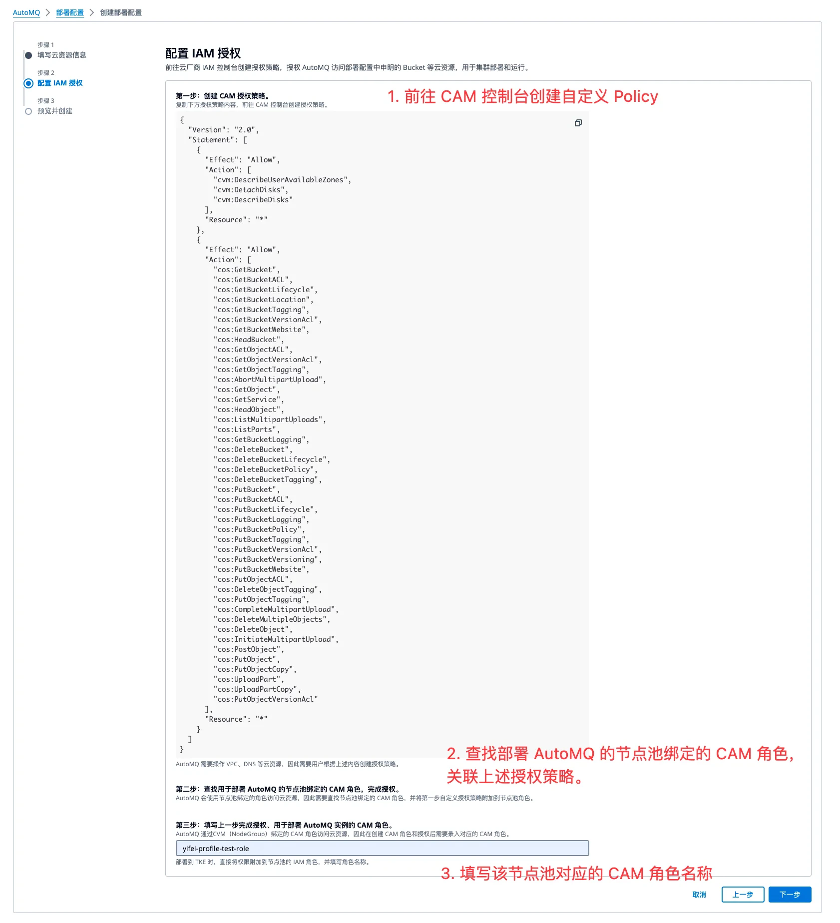 - 填写云资源信息后,生成数据面 TKE 节点池需要授权的权限。参考控制台指引,创建自定义授权策略 。然后将授权策略绑定到步骤 2 创建的 AutoMQ CAM 角色,并录入该节点池角色名称 ,点击下一步预览 。