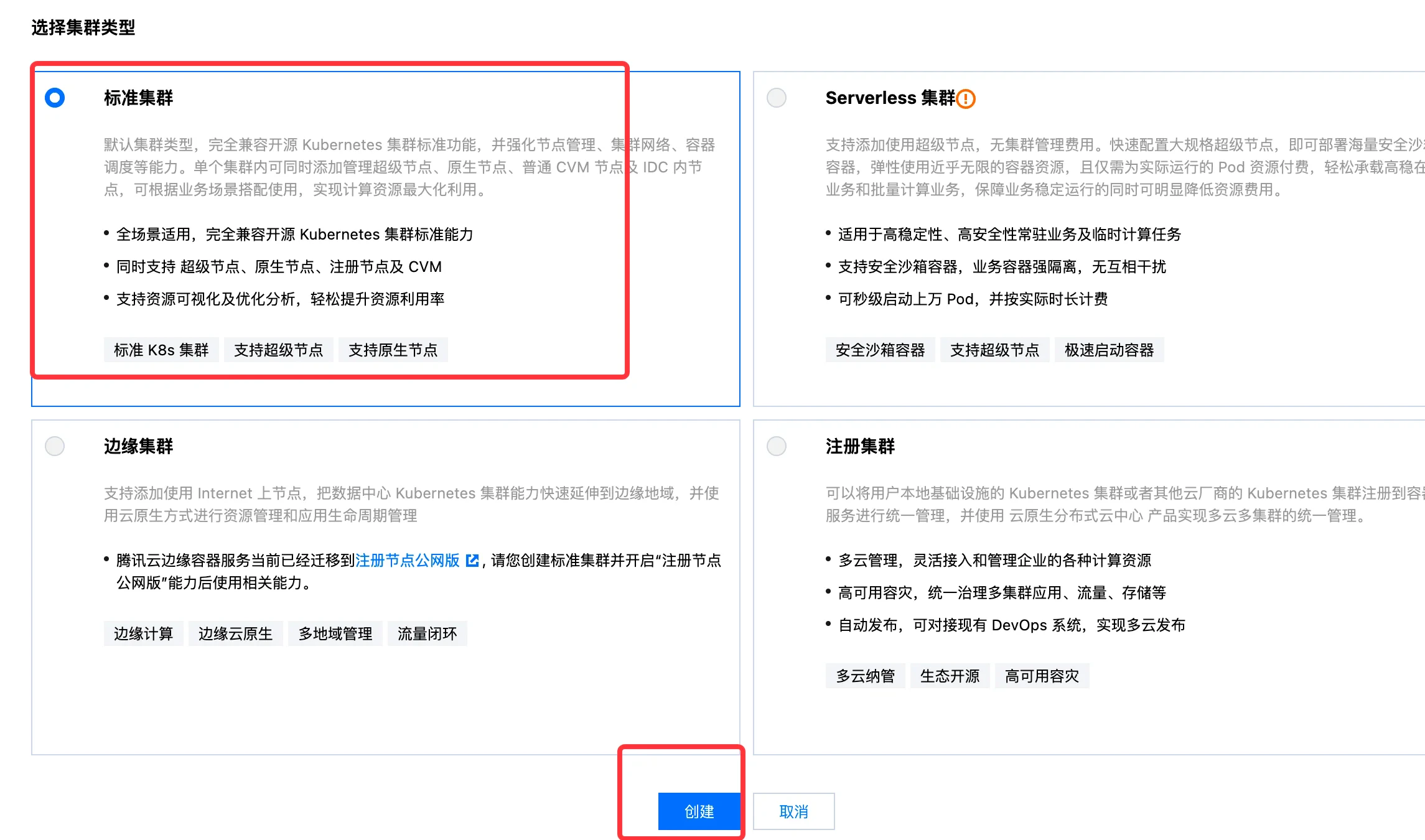 - 选择集群类型为标准集群。