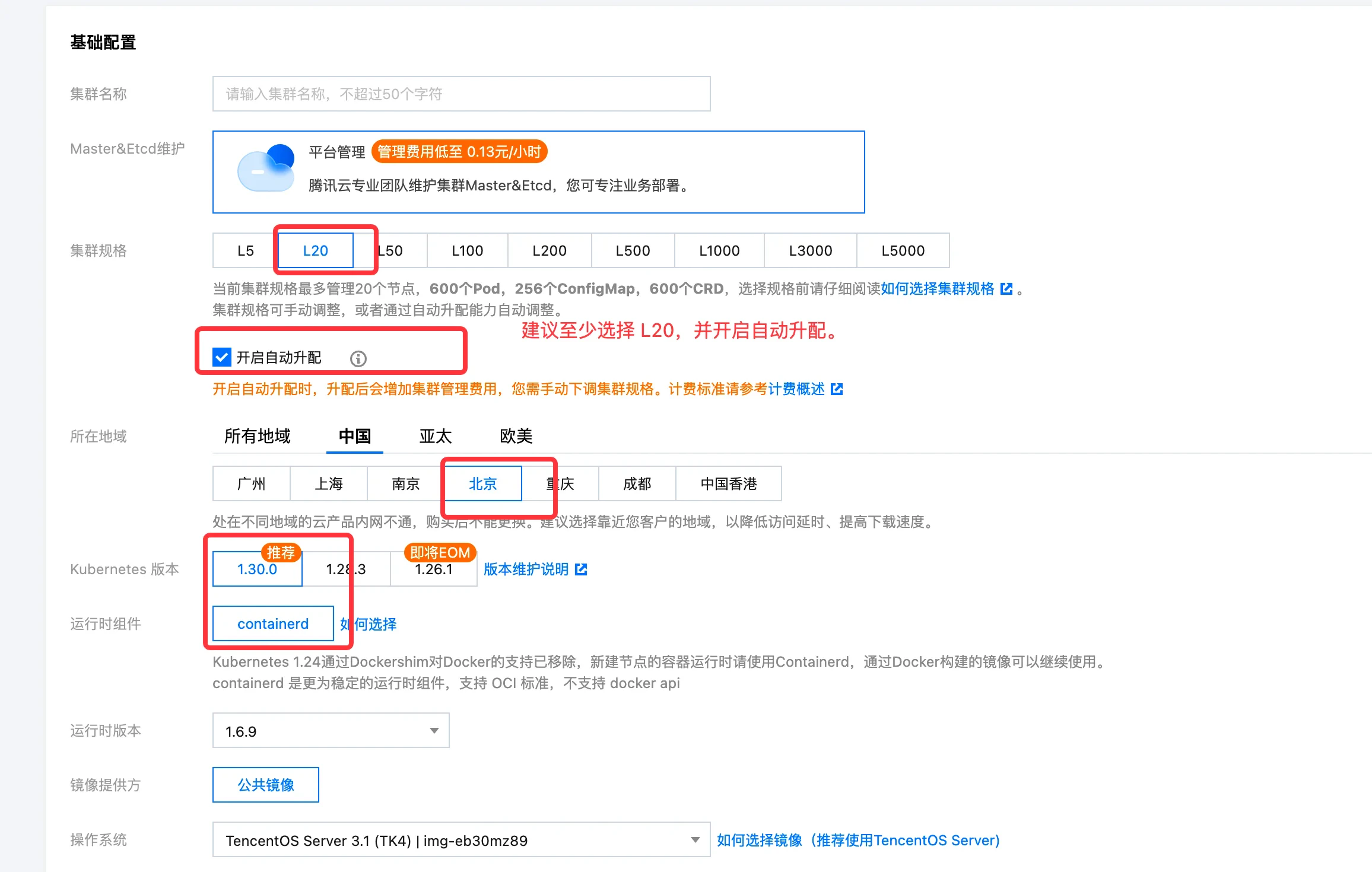 建议至少选择 L20,管理 20 个左右节点,并开启自动升配。防止因 TKE 能力不足导致无法扩缩容。