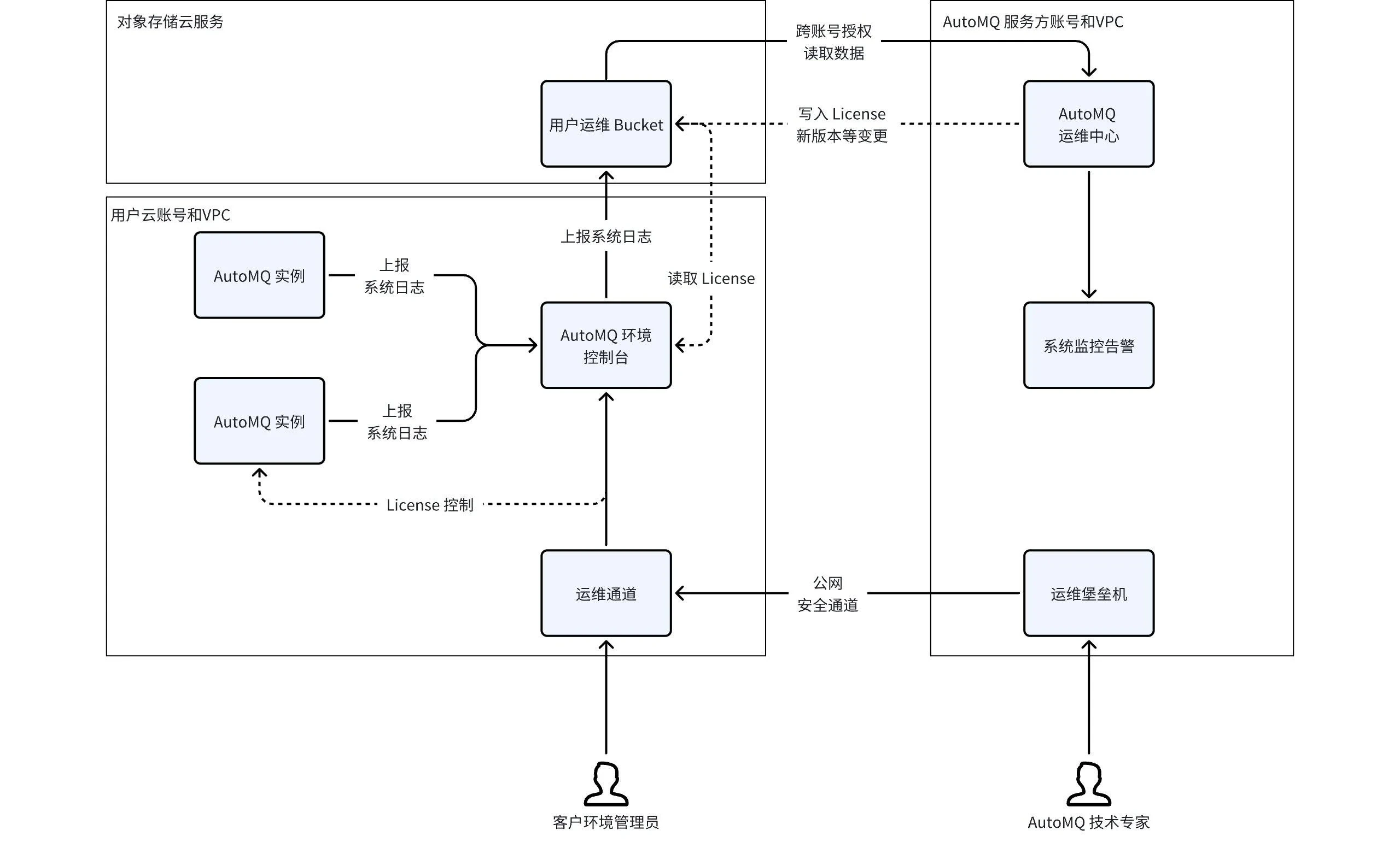 - 场景 2:订阅 License 动态更新、新版本更新推送,需要写权限。 AutoMQ BYOC 环境的订阅 License 在触发续费、升降配、新版本 Release 后,环境内控制组件需要感知新的订阅信息、新版本的元数据。此时,AutoMQ 服务方通过运维 Bucket 写入新信息,环境控制台动态加载。