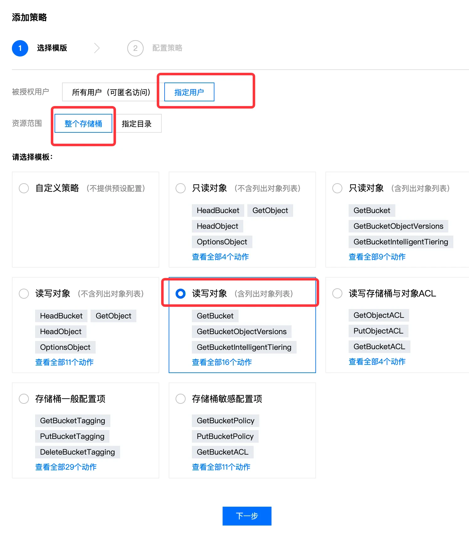 - 授权模板:选择读写对象(含列出对象列表)。