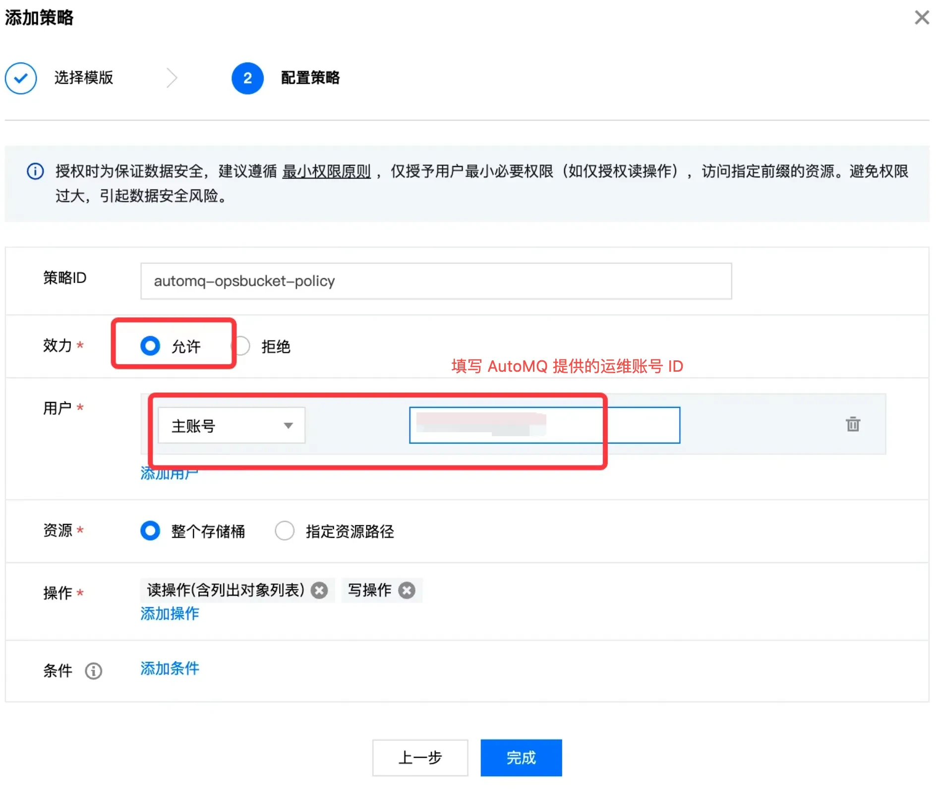 - 点击下一步,填写被授权的 AutoMQ 运维账号信息,选择 允许 效力,完成 Policy 创建。