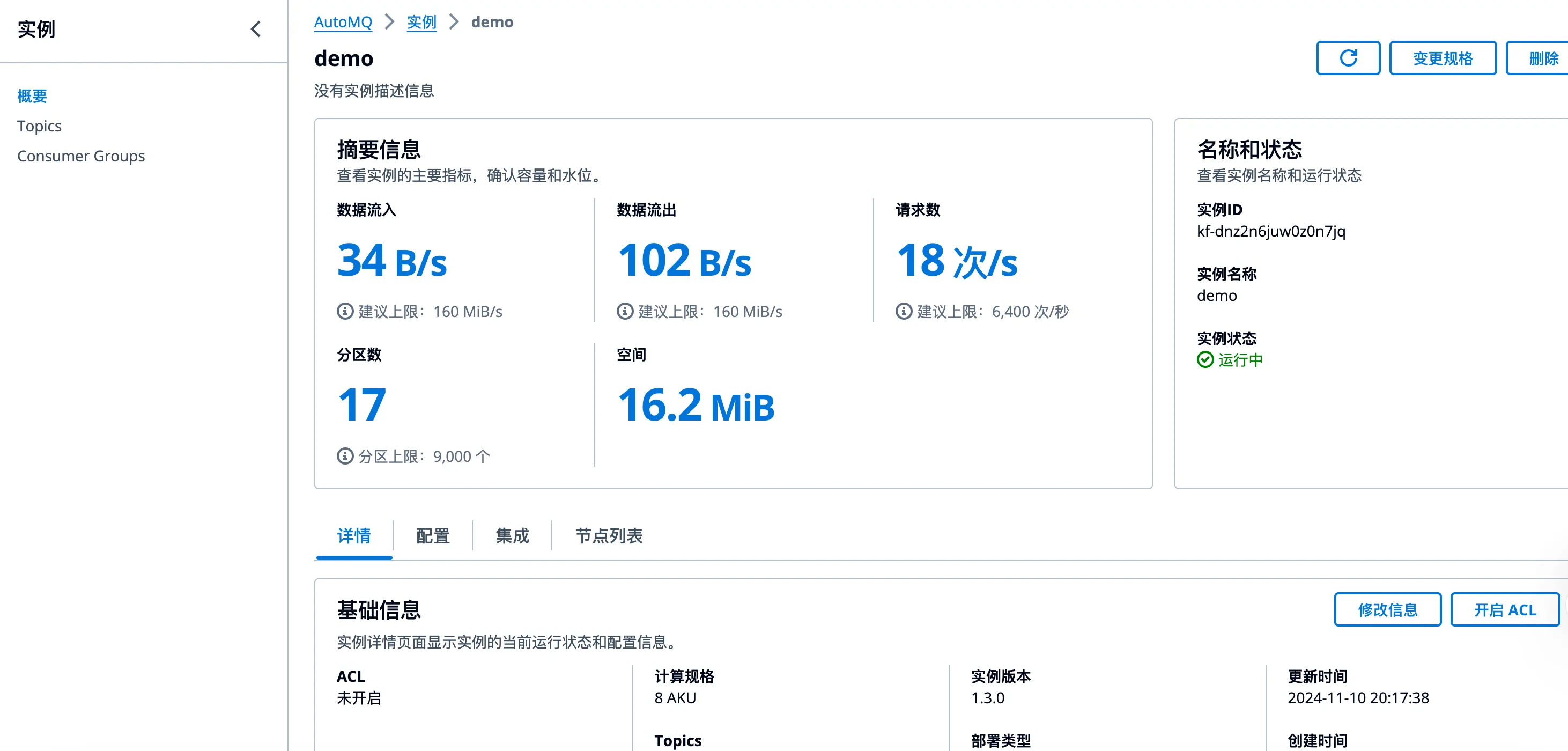 - 体验 AutoMQ 收发消息首先需要创建 Kafka 实例。