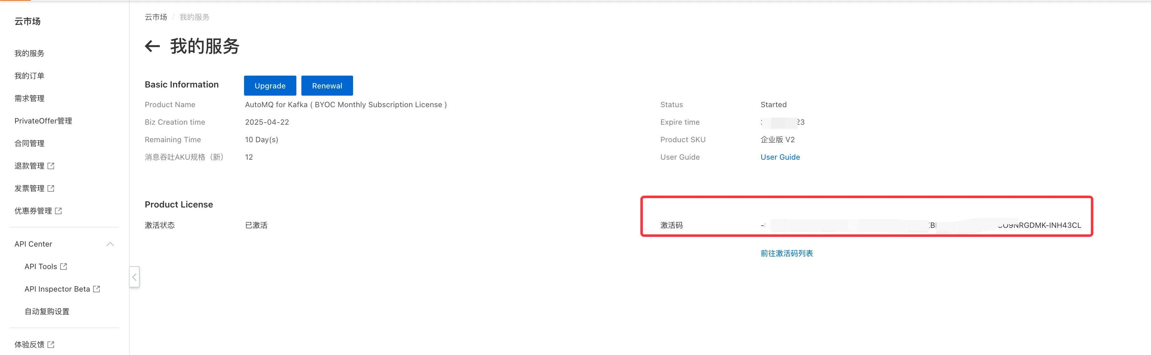 - 购买完成后,前往云市场买家控制台 -> 已购买的服务 详情,查看授权码信息。