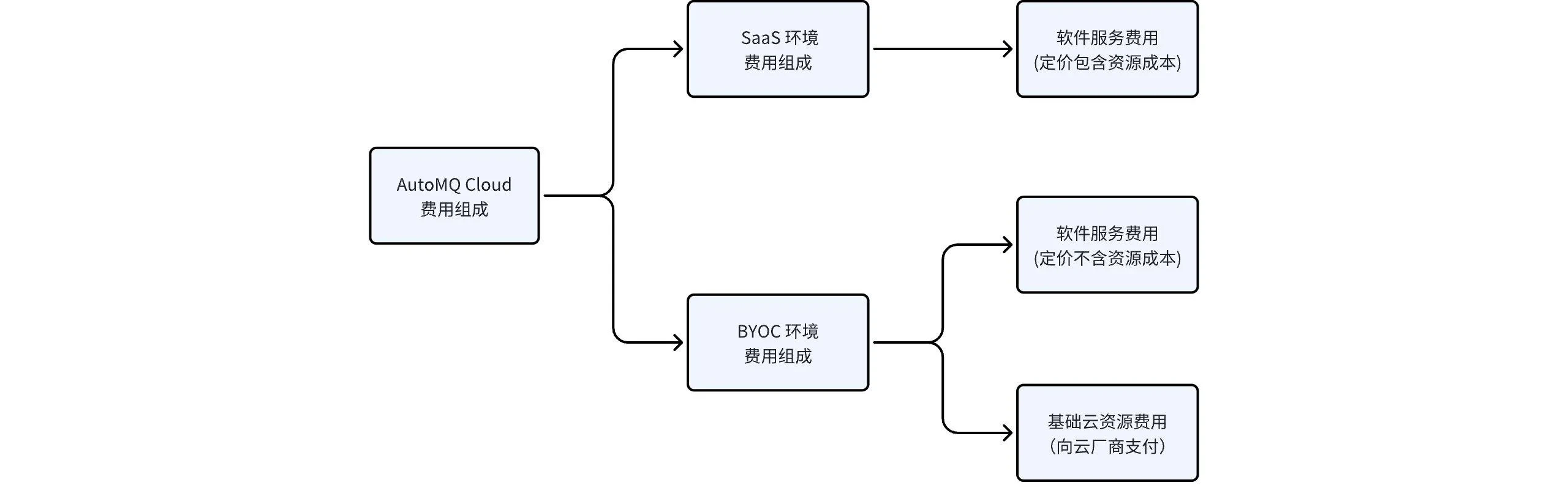 AutoMQ Cloud 所有产品和实例都部署在环境内。参考 AutoMQ Cloud 环境定义和分类, SaaS 环境以及 BYOC 环境的底层资源归属和运维方式存在差异,因此针对不同的环境类型,用户的计费组成也存在差异。 用户使用 AutoMQ Cloud 会产生费用分类如下:| 费用类型 | 涵盖范围 | 适用环境类型 | 付费关系 |