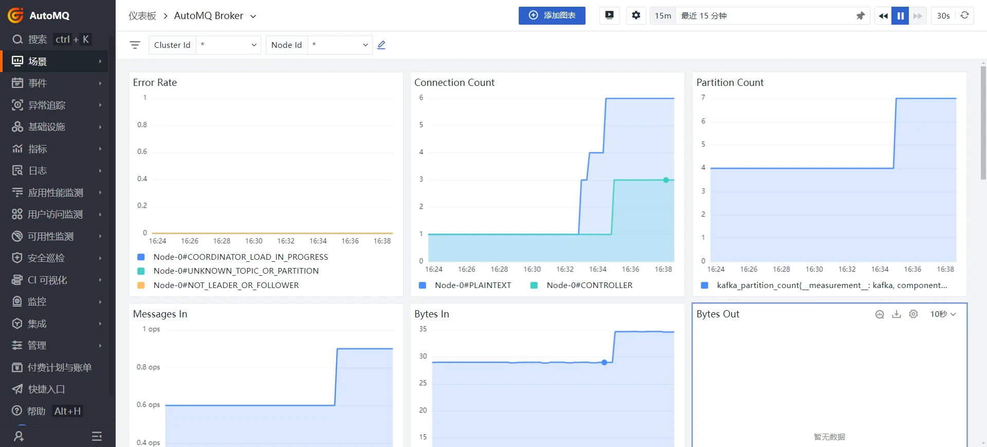 观测云的AutoMQ Broker 仪表盘描述了所有 Broker 的一些指标、比如连接数、分区数、每秒接受到的消息数量 ops 以及每秒输入和输出的数据量,单位是 Byte。