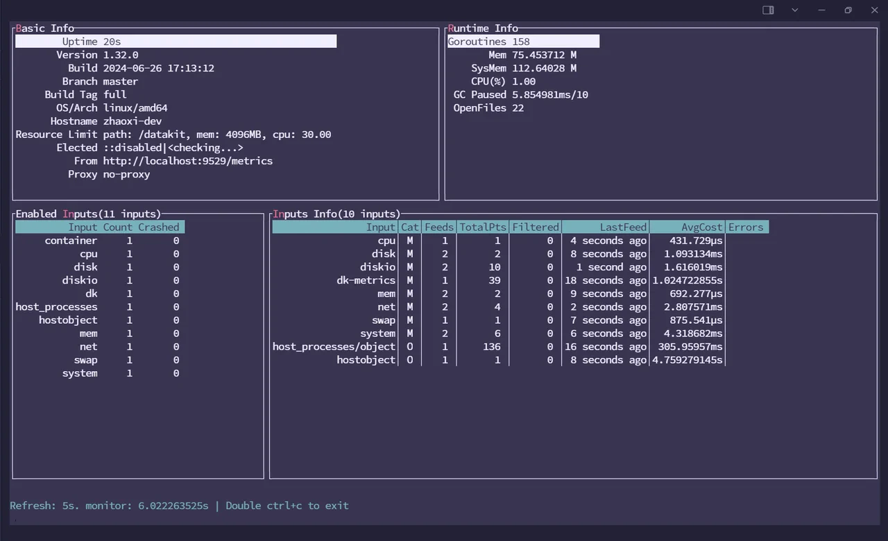 datakit monitor 可以验证 DataKit 是否成功安装。