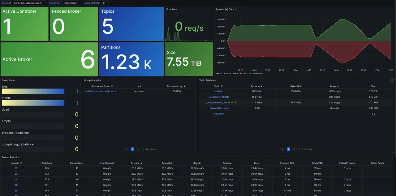 Cluster Overview: 提供了集群级别的监控信息,包括节点数量、数据大小、集群流量等指标。此外,还提供了 Topic、Group、Broker 等维度的概览指标,并支持进一步查看详细监控信息的下钻功能。