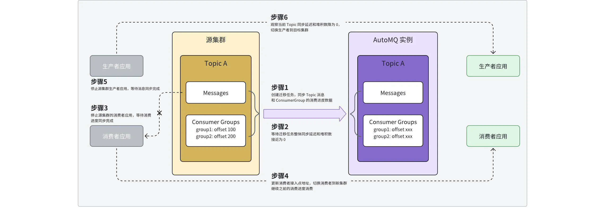 - 消费者切换: 迁移工作除去数据同步,还需要在合适的时机切换消费者应用,使消费者连接目标集群接续之前的消费进度继续消费消息。