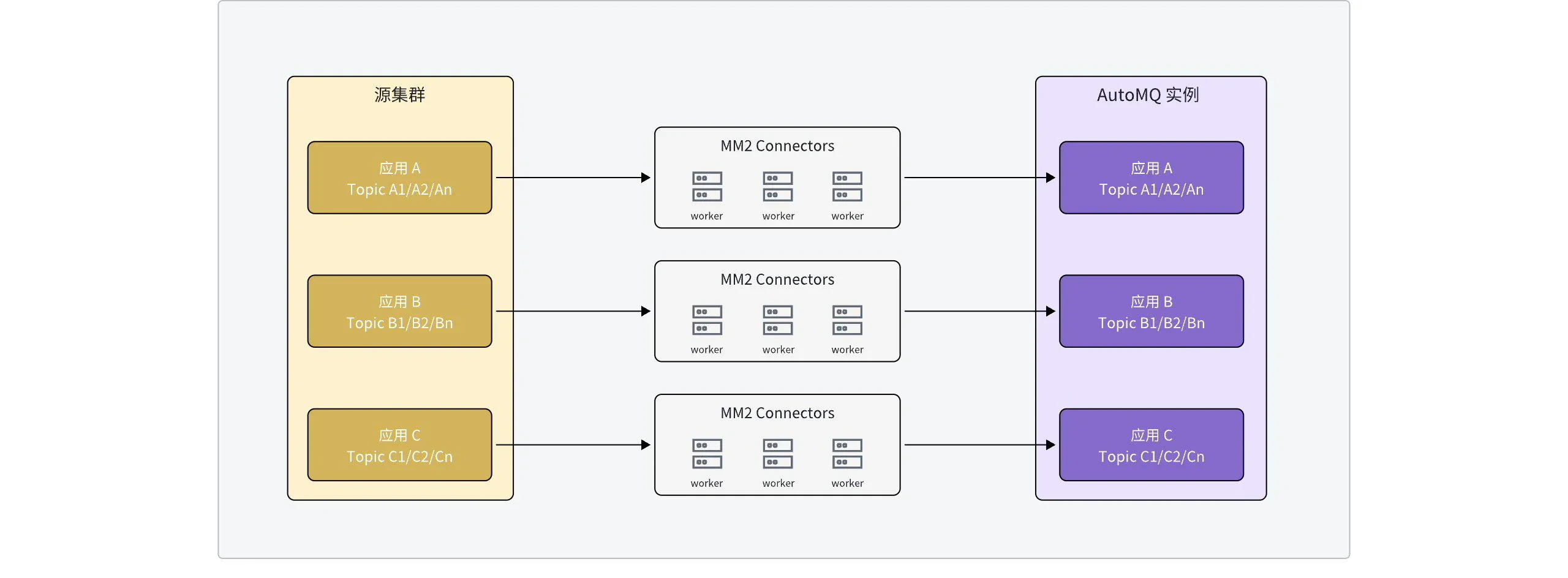 AutoMQ 开源版推荐使用 MirrorMaker2 工具实现集群间迁移,支持从 Apache Kafka 或者其他 Kafka 发行版迁移至 AutoMQ。 MirrorMaker2 迁移工具具备如下能力:- 支持分批次迁移集群: MirrorMaker2 支持源集群到目标集群内分批次迁移 Topic 和 Group,实现灰度和验证。
