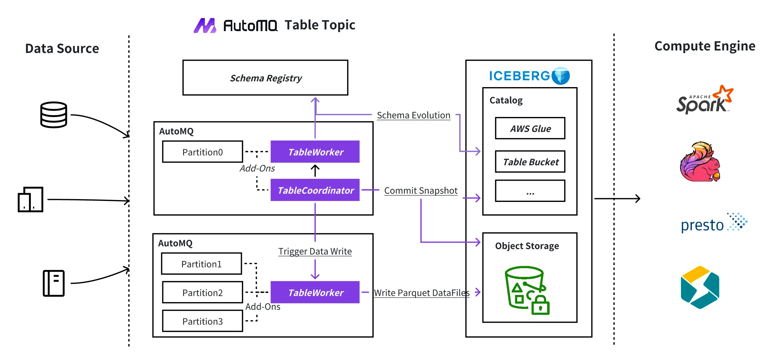 - 无缝集成 AWS S3 Table: Table Topic 无缝集成 S3 Table,利用其 Data Catalog 和维护功能,如压缩、快照管理和未引用文件删除。此集成还通过 AWS Athena 促进了大规模数据分析。